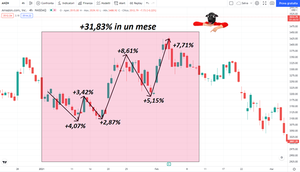 Come puoi vedere, anche in questo caso abbiamo a che fare con il grafico di Amazon, ma stavolta il periodo preso in esame è parecchio più breve, un mese. Adesso osserva il rendimento, +31,83% in un solo mese, rispetto al 7,72% di un investimento a lungo termine che preveda una sola posizione d’acquisto.